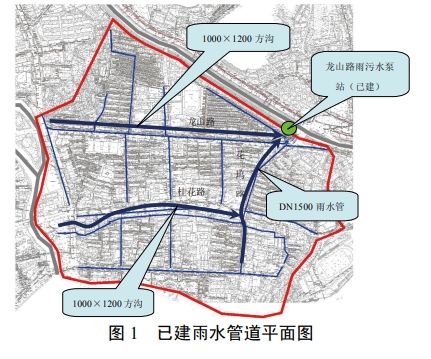 已建龙山路雨污水泵站为全地下式雨污水合建泵站,雨水泵站规模为 1.0m/s,污水泵房规模为 5万 m'/d。自建成至今,泵站总体运行正常。但由于北渠抬水工程正处在实施阶段,实施后北渠水位抬高,地区雨水将无法自排入渠,龙山路泵站泵排能力无法满足区域内雨水的排放要求,