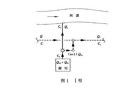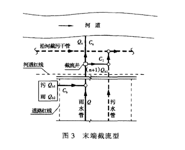 沿河截污系统中截流井的设置形式主要有以下2种:一种是将截流井设在合流管接入截流主管道之前的末端位置上,称之为【型,如图1所示:另一种是将截流井设在截流主管道与合流管交叉的位置上,称之为Ⅱ型,如图2所示。